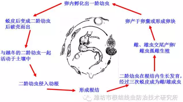 线虫的主要初侵染来源是病土和病根。种植带有病土和病根的种苗是远距离传播该病的主要途径。生产中,线虫借雨水和灌溉水,粪肥、农具以及人畜活动传播。