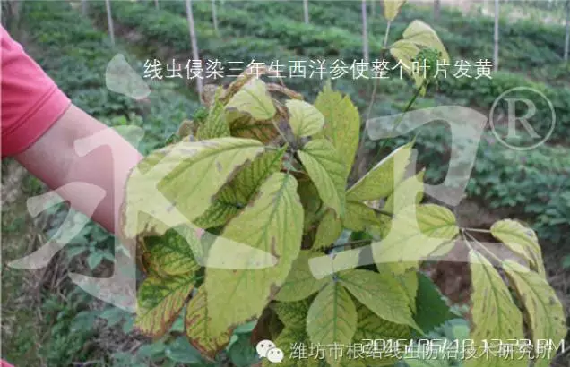 西洋参线虫为害参根,受害根部遭受线虫食道分泌物的刺激,形成根结,影响根系的正常机能,导致植株弱小,叶片发黄失绿,开花迟,回苗早。一般能减产20%~30%,严重时可达70%以上。同时,线虫的侵入必留有伤口,可成为土壤中其它病原物的侵入口,造成线虫与锈腐病、根腐病等病害的复合感染;又因线虫病的侵染使参苗生长势减弱,极易感染灰霉病、黑斑病等病害,从而加重了生产的损失。