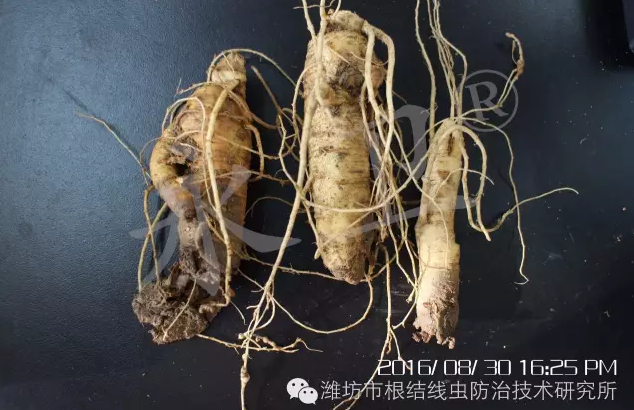 以上照片是西洋参被根结线虫侵染引起的叶片发黄、失绿,须根变粗,水浸状(水根),严重时线虫在须根内繁衍增多,形成典型的圆粒状根结。