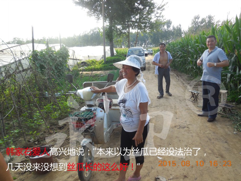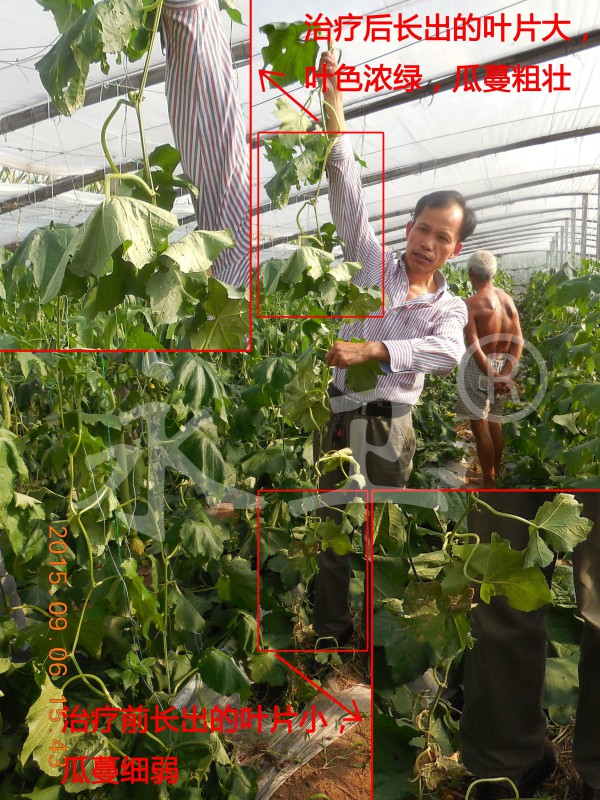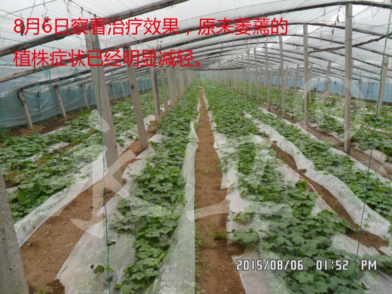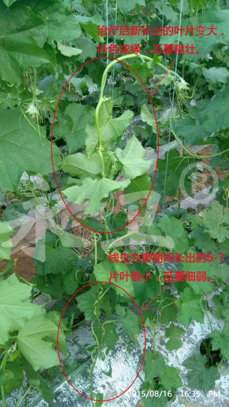 8月15日,寿光市著名蔬菜专家农业局高级农艺师张兴德到示范棚察看治疗效果,发现丝瓜已经完全恢复了正常生长状态,地上部叶片健壮、颜色鲜绿,完全没有了原来的萎蔫症状,根结线虫已经得到全面控制!