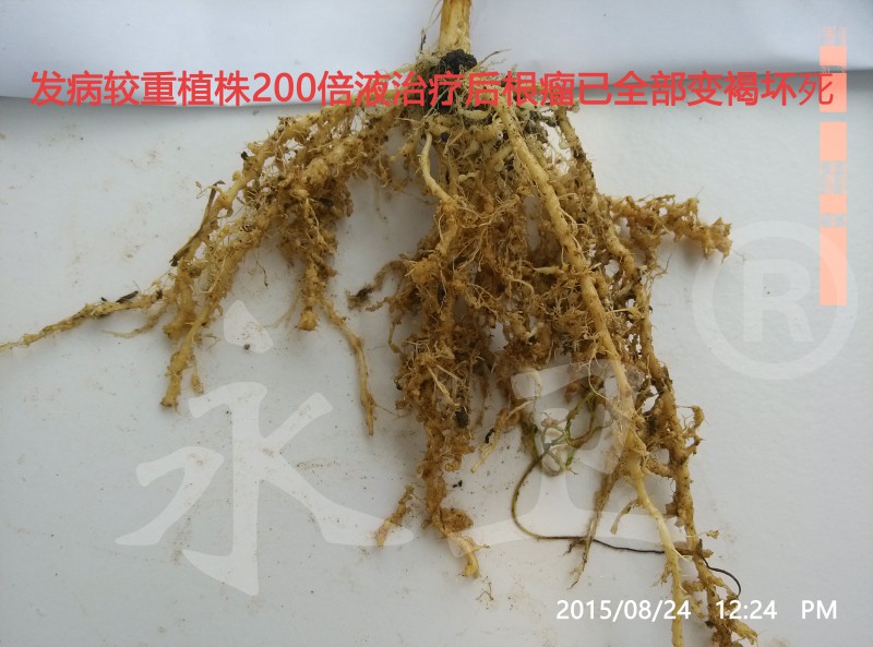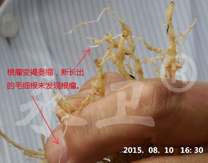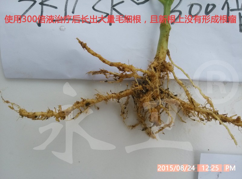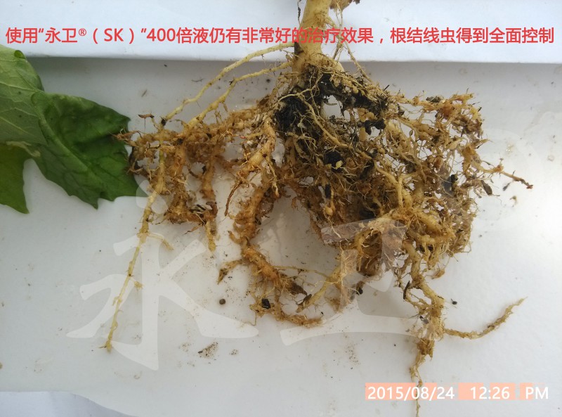观摩会距使用“永卫®(SK)”已10天,植株萎蔫症状已全部消失,地上部正常生长,地下部根瘤变褐萎缩,新长出的毛细根未发现根瘤,说明没有根结线虫再侵染,使用300-500倍药液能有效地控制根结线虫为害;100倍和150倍灌根的植株地上部长势非常好,说明本品在此倍数下不伤根。