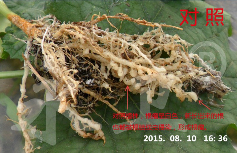 没有使用“永卫®(SK)”治疗的对照植株,根瘤呈白色,新长出来的根也都被根结线虫侵染,形成根瘤。