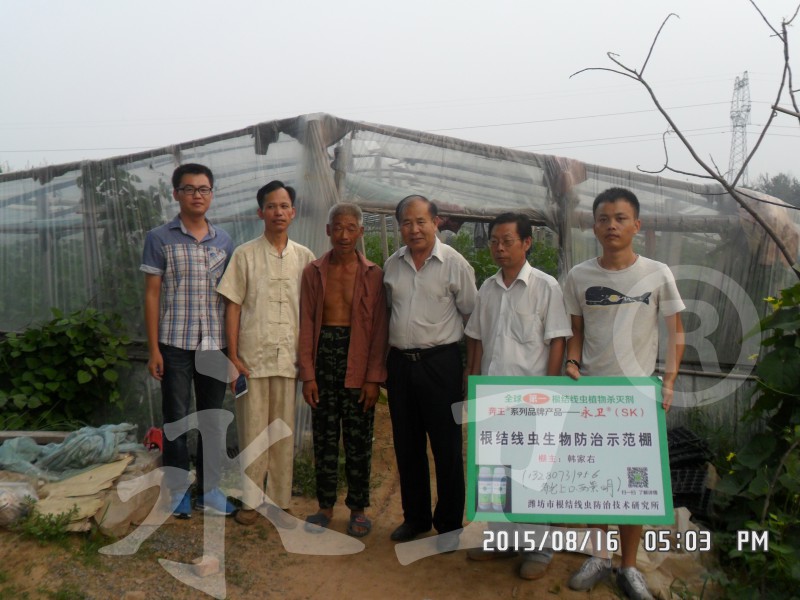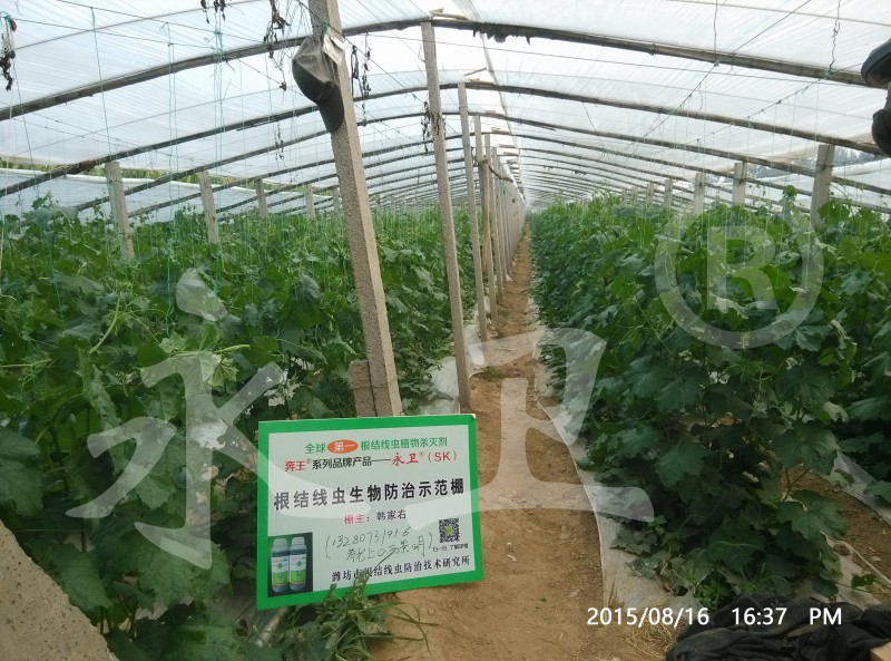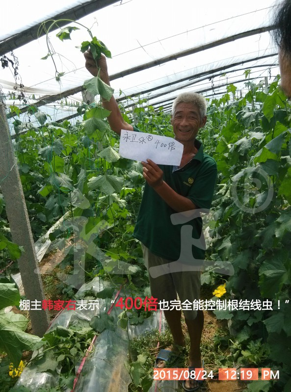 通过本案例可以看出:本所研发的以“永卫®(SK)”为主剂的根结线虫生物综合防控技术能很好的解决目前最严重的丝瓜根结线虫病问题,防治效果突出;“永卫®(SK)”100倍液高浓度下不伤根不伤苗;300、400和500倍对根结线虫防治效果理想。本技术易学易掌握,操作简便,为寿光及全国菜农、瓜农提供了有效的根结线虫生物防治技术。“永卫®(SK)”是降低农产品农药残留的首选生物农药。