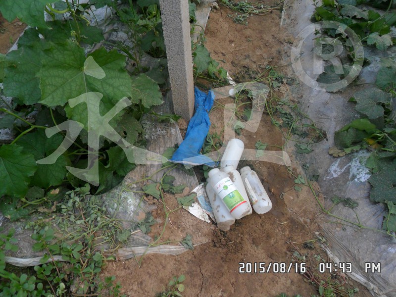棚主韩家右(右一)联系潍坊市根结线虫防治技术研究所后,本所所长毕乃亮(左一)同寿光市著名蔬菜专家农业局高级农艺师张兴德(左三)于7月30日到大棚察看病情,确定为根结线虫病并给出治疗方案:使用“永卫®(SK)”200倍灌根,每株灌药液500毫升(1斤),同时本所技术人员做了“永卫®(SK)”不同稀释倍数的对比示范,倍数分别为100、150、200、250、300、400、500、600倍。