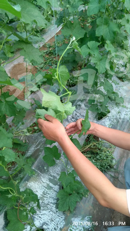8月16日,本所所长毕乃亮会同潍坊资深线虫专家刘伟平(右二)、山东卫视农科频道高级农业顾问张传义(右三)等到现场察看治疗效果,丝瓜已全部恢复正常生长,线虫为害期间长出的6-7片叶很小,瓜蔓细弱;治疗后新长出的叶片变大,叶色浓绿,瓜蔓粗壮,防治效果非常理想,到场专家非常震撼!