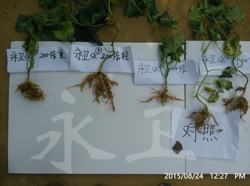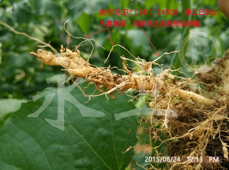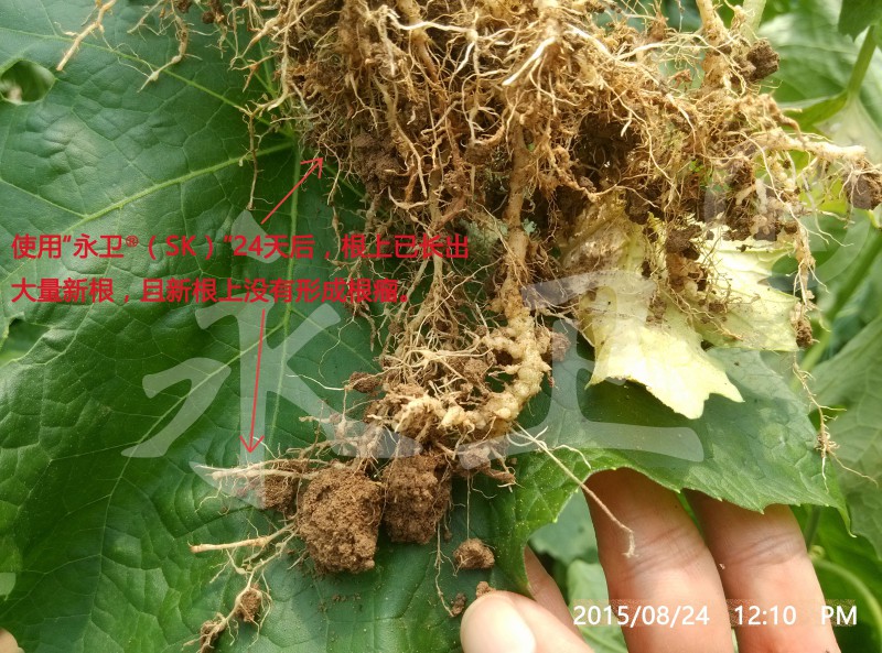 没有使用“永卫®(SK)”的植株,地上部瓜蔓细弱,没有开花结果,整棵植株长度远远短于使用“永卫®(SK)”灌根的植株;地下部根瘤仍为白色,根上看不到新的毛细根,整个根上布满小米粒至绿豆粒大小的根瘤。