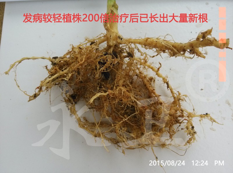 8月24日,距离上次灌药已25天,本所专家再次来到示范棚,棚主韩家右按照本所制定的使用规程准备再次灌药,巩固治疗效果。棚里使用“永卫®(SK)”灌根的丝瓜地上部生长健壮,生长快的植株丝瓜长度已超过30厘米,200倍稀释倍数下原来发病较重的植株根部根瘤已全部变褐萎缩,根瘤旁长出大量毛细根,且新根上没有根瘤,300倍和400倍稀释倍数处理植株根部也已长出大量毛细根,植株全部恢复正常生长,防治效果非常理想。