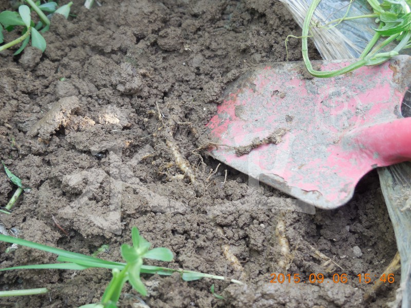 韩家右丝瓜大棚棚龄5年,2015年7月17日定植,定植前用了5袋复合肥,7月29日发现丝瓜出现萎蔫,棚主以为是肥害,请本村村民查看症状,拔根后发现根部有大量小米粒至绿豆粒大小的根瘤,初步判断为根结线虫病。前几年每年大棚发生根结线虫病后也会使用各种药剂防治,但都没能控制住。