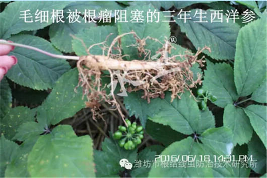 西洋参线虫为害参根,受害根部遭受线虫食道分泌物的刺激,形成根结,影响根系的正常机能,导致植株弱小,叶片发黄失绿,开花迟,回苗早。一般能减产20%~30%,严重时可达70%以上。同时,线虫的侵入必留有伤口,可成为土壤中其它病原物的侵入口,造成线虫与锈腐病、根腐病等病害的复合感染;又因线虫病的侵染使参苗生长势减弱,极易感染灰霉病、黑斑病等病害,从而加重了生产的损失。