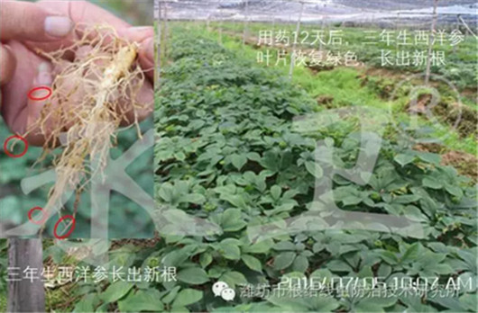 使用“永卫®168”防治线虫35天后,二年生西洋参的红叶(水锈)现象得到改善,斑点变淡、消失,叶子上的水锈斑点越来越少,发黄叶片变为绿色,颜色浓绿,线瘤上发出新根,新根上没有根瘤。三年生西洋参叶片越来越绿,以主叶脉为起点,绿色逐渐蔓延整个叶片。