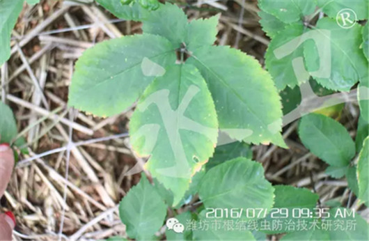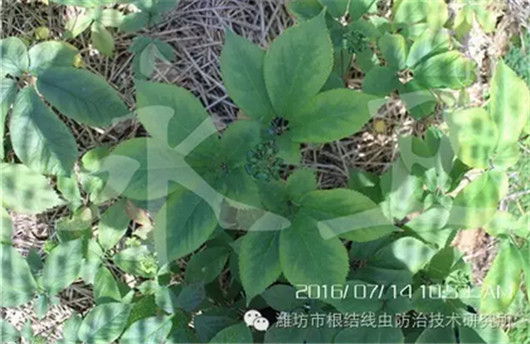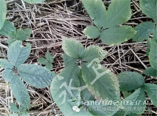 威海爱东西洋参专业合作社王总的西洋参基地面积300多亩,基地内有1年生、2年生的西洋参参苗以及3年生西洋参植株,栽培密度约80000株/亩。2015年下半年开始发现植株出现叶片失绿变黄、叶缘焦枯等症状,拔根后发现根部带有颗粒状的根瘤,且根毛非常少,初步诊断为线虫病,用过多种药剂以及对线虫有抑制作用的菌肥后并没有控制住线虫病的发展。