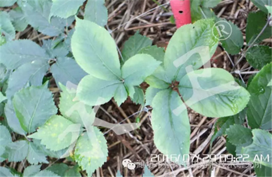 3年生西洋参使用“永卫®168”后黄叶转绿、红叶变绿、焦叶叶脉及叶肉转绿。