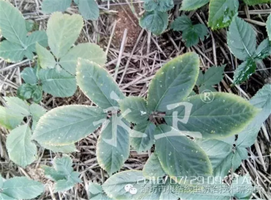 王总联系潍坊市根结线虫防治技术研究所后,所长毕乃亮一行于2016年6月18日来到爱东西洋参专业合作社查看病情,确定为线虫病并且采样带回研究所,经本所特聘植保、线虫、蔬菜、土肥等专家进行会商,为西洋参基地制定了针对线虫的治疗方案:用“永卫®168”1000倍进行灌根处理,1年生和2年生的参苗亩用量2斤兑水2000斤(1000倍液),3年生植株亩用量3斤兑水3000斤(1000倍液),将药液灌到植株根部,同时配合使用生根剂。6月23日,农技师张华彬安排工人首先在发病严重的3年生西洋参上开始用药。