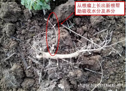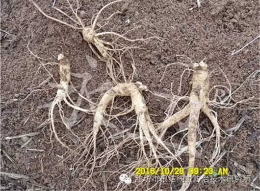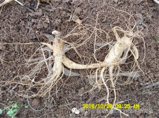 三年生西洋参芽孢粗壮饱满、表面光滑、颜色漂亮、根须茂盛,基本没有根腐病、锈腐病发生,总体来看“永卫®168”防效高达95%以上!西洋参上的根瘤变褐色、腐烂,根瘤里的线虫已经被杀死。使用“永卫®168”后,从根瘤上发出新根,根瘤不妨碍根系吸收水分、养分,西洋参能够正常生长。
