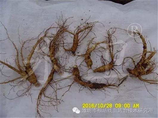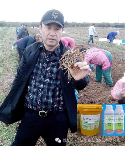 潍坊市根结线虫防治技术研究所自2016年6月18日初识西洋参线虫为害,至2016年10月28日,历时4个多月,帮助威海爱东西洋参专业合作社用生物方法解决线虫问题。按照我们的技术规程使用“永卫®168”治疗西洋参线虫,完全可以达到90多天没有线虫侵染的效果,持效期长,治疗效果达95%以上!“永卫®168”为植物源农药,不伤根苗,对西洋参幼苗高度安全,毒性低,无残留,不易产生抗药性,符合西洋参病虫害绿色综合防控的生产技术要求,是目前国内解决西洋参线虫问题、降低西洋参农残、提高产量品质的首选生物农药。