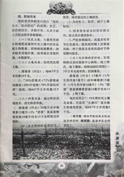 三七、人参等线虫病害严重地区根据当地物候期可参考本所西洋参生防技术规程进行科学防治。