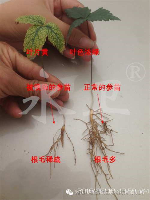 以上照片是西洋参被根结线虫侵染引起的叶片发黄、失绿,须根变粗,水浸状(水根),严重时线虫在须根内繁衍增多,形成典型的圆粒状根结。
