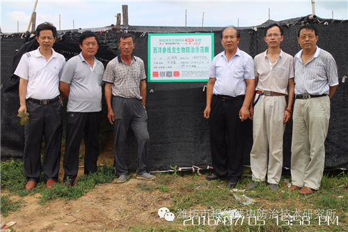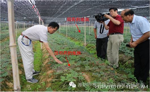 7月5日,潍坊市根结线虫防治技术研究所组织专家到王总的西洋参种植基地进行现场指导,到场的专家主要有本所所长毕乃亮(右二),山东卫视农科频道高级农业顾问张传义研究员(右三),潍坊市著名蔬菜育苗专家任大文副教授(右一),潍坊职业学院植保专业副教授徐桂平(左一)等。所长毕乃亮介绍了“永卫®168”治疗西洋参线虫的整个过程,并向到场专家及技术人员讲解了“永卫®168”的使用方法及注意事项。