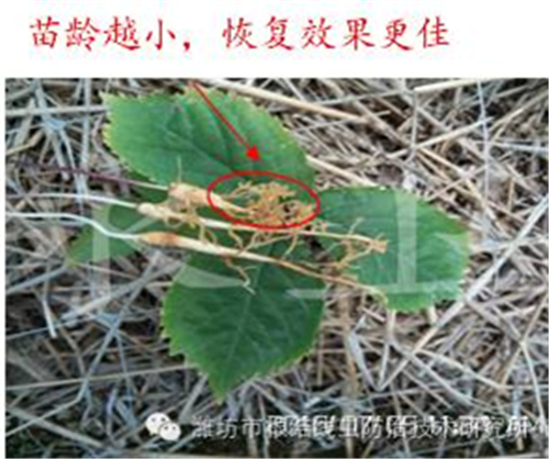 使用“永卫®168”灌根仅12天后,不同年限的西洋参叶片失绿发黄症状已全部消失,叶片沿叶脉恢复绿色,地上部正常生长,地下部开始长出新的大量毛细根并且没有根结,苗龄小的参苗使用后效果更加明显。这些现象说明,使用“永卫®168”1000倍药液能够有效地控制西洋参线虫的为害,促进参苗生出新的根系,防止线虫的侵染。基地负责人王焕模以及农技师张华彬对“永卫®168”的治疗效果非常满意,当场表示将马上在未用药的西洋参地块上用“永卫®168”进行灌根处理治疗线虫。