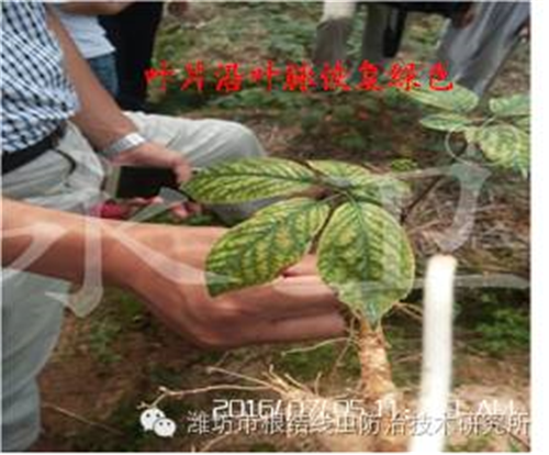 王爱东(左二)联系潍坊市根结线虫防治技术研究所后,所长、高级农艺师毕乃亮(左三)一行于6月18日来到西洋参基地查看病情,确定为线虫病并且采样带回研究所,经所特聘植保、线虫、蔬菜、土肥等专家进行会商,为西洋参基地制定了针对线虫的治疗方案:用“永卫®168”1000倍进行灌根处理,1年生和2年生的参苗亩用量2斤兑水2000斤(1000倍液),3年生植株亩用量3斤兑水3000斤(1000倍液),将药液均匀喷雾在植株根部,同时配合使用生根剂。