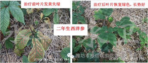 使用“永卫®168”处理后,1年生、2年生的参苗以及3年生的西洋参植株均慢慢恢复正常生长,叶片发黄失绿现象消失,叶片恢复墨绿色,比治疗之前的叶片大很多,基地里一片生机盎然。王总表示对“永卫®168”的效果非常满意,将在他的300多亩基地里全部使用“永卫®168”防治线虫,并将向当地其他西洋参种植户推荐“永卫®168”防治线虫问题。