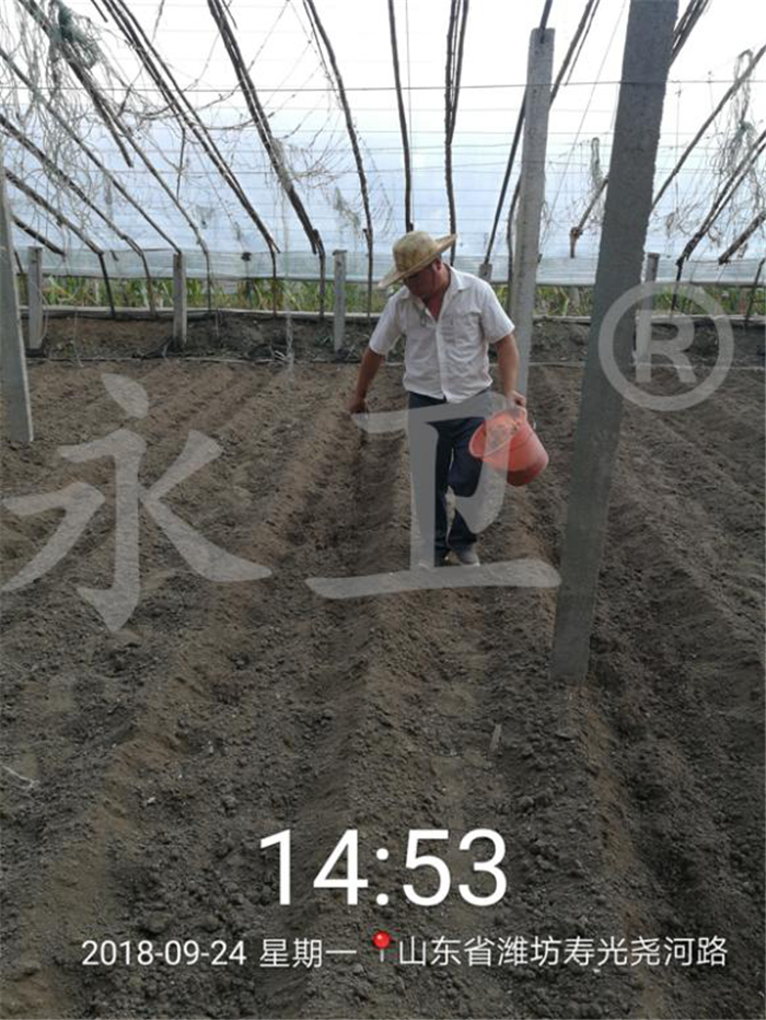 在李茂华的黄瓜大棚做了“永卫® KD”颗粒预防示范,棚东0.65亩约434平方米,施用2袋颗粒,拌土后均匀穴施。