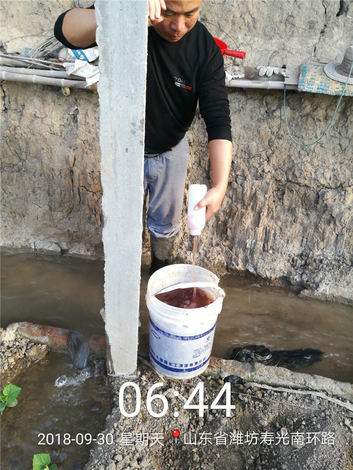 定植后水剂使用情况(棚西半部分):2018年9月30日(定植后第6天) 上午小水冲施。西部0.65亩地用“永卫® AA”水剂,小水冲施。根据出水量计算(水泵每小时出水量为40方水,小水冲施15分钟)稀释浓度约为5000倍。