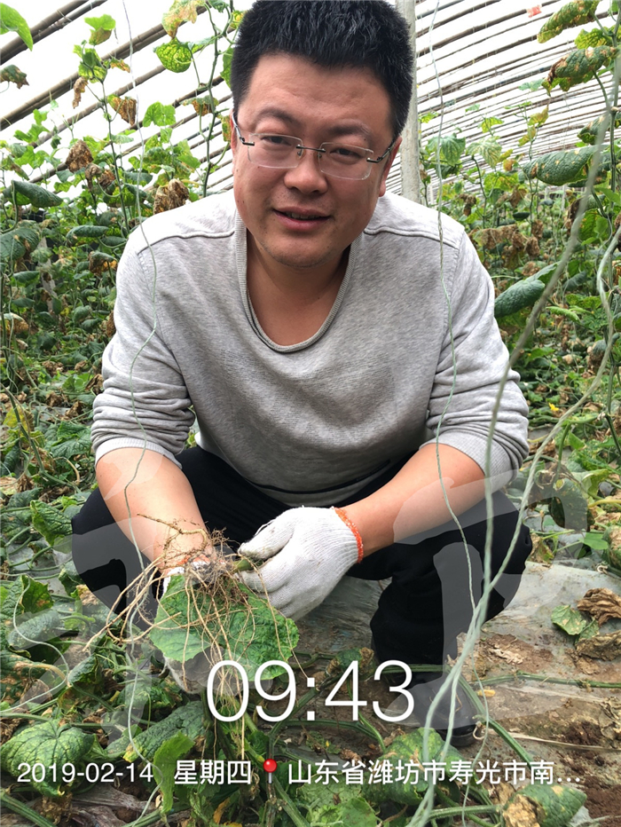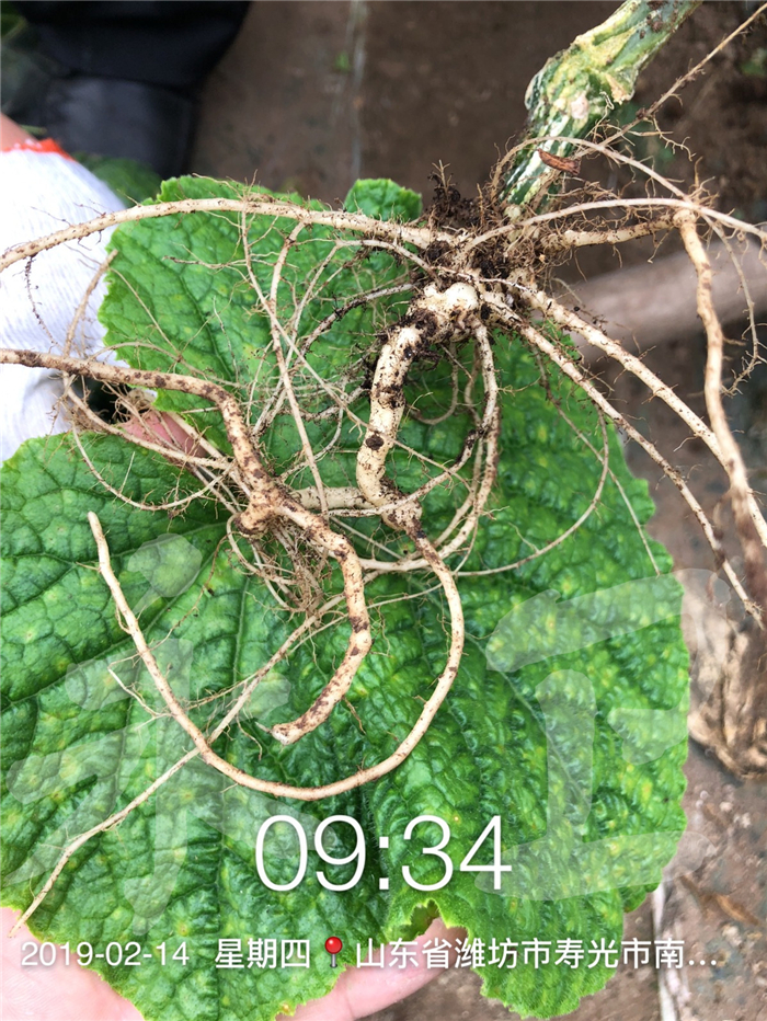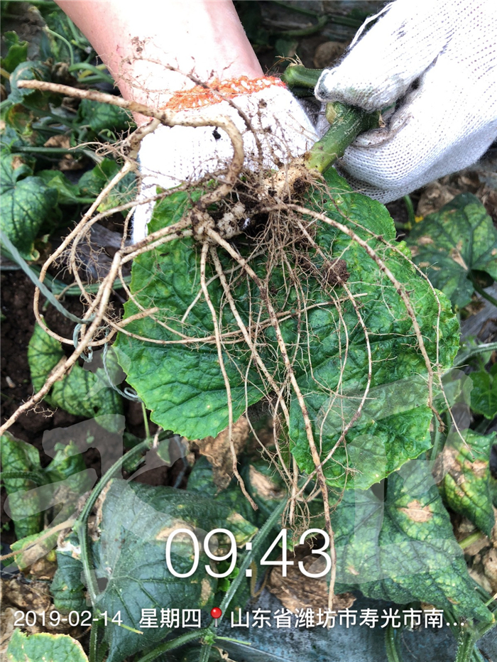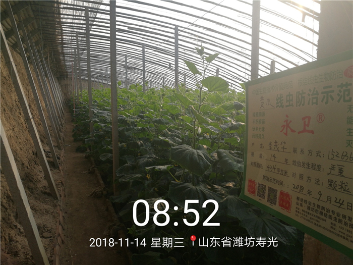 从定植到今天51天为确保黄瓜无根结线虫的为害,我们全棚1.3亩用4KG“永卫®AA”水剂滴灌。