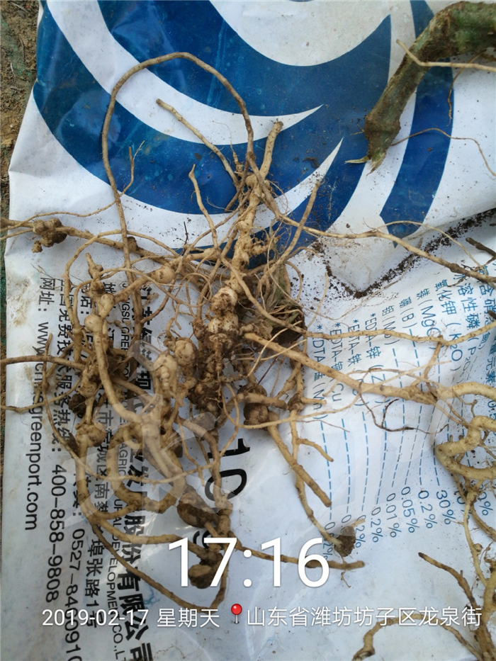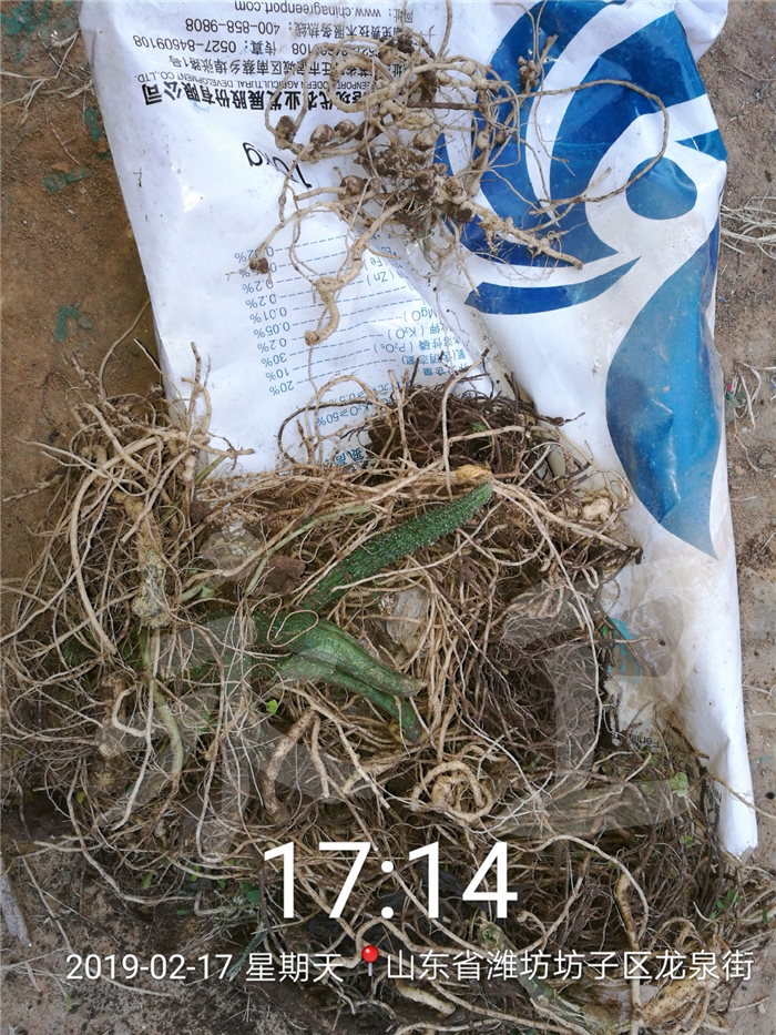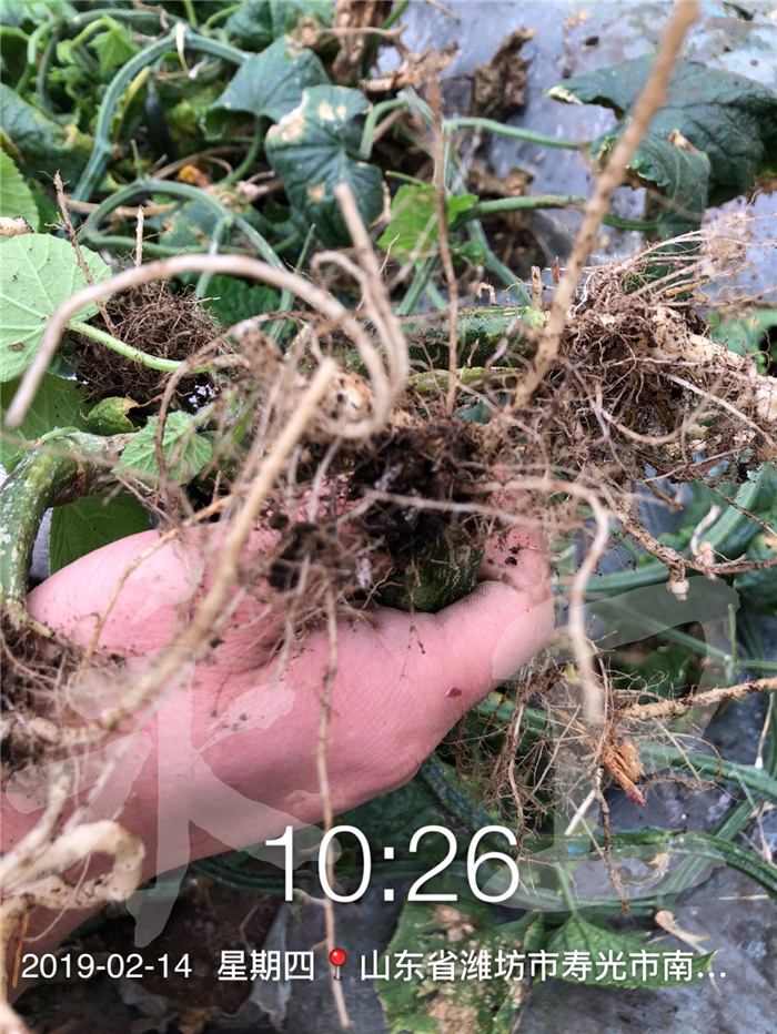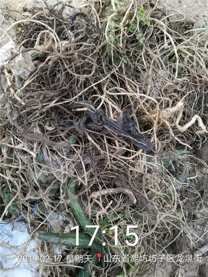 拔完园后2019年2月15日、16日整地,马上种下茬黄瓜,整地时候打地在最东面畦子边角处发现有根瘤(共找到两棵根,整地后捡出少量有根瘤的根)。