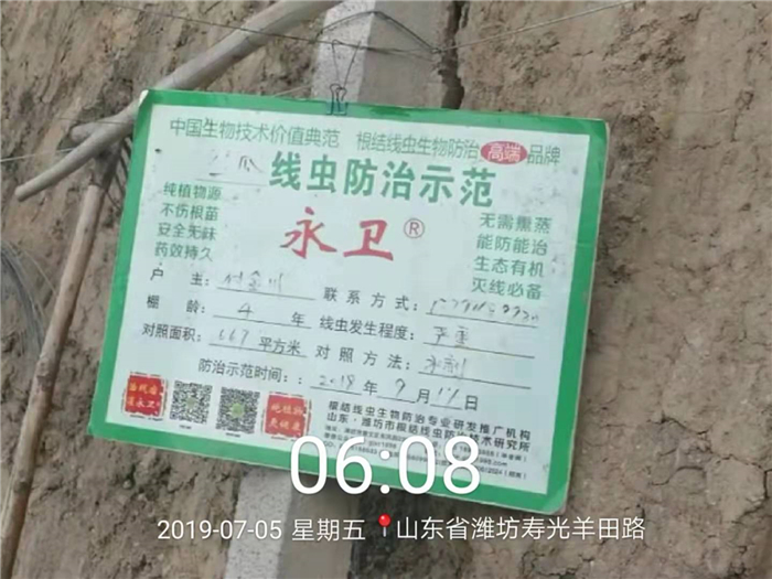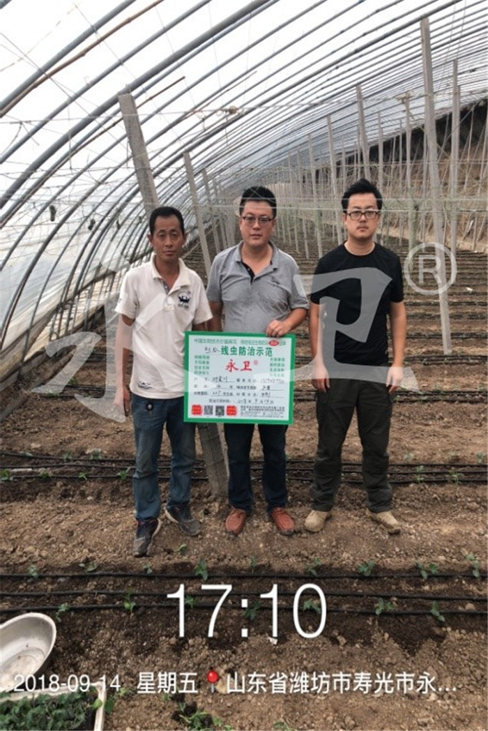 2018年9月14日定植时使用“永卫®”(颗粒水剂各半个棚),定植后一个月使用“永卫®AA”水剂一次,生长期约10个月共使用“永卫®”5次,2019年7月5日拔园,防效达95%以上。