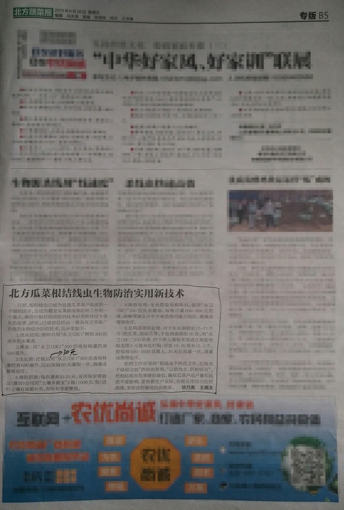 2015年6月26日《北方蔬菜报》创刊15年来首次总结根结线虫防治攻略,并报道了根结线虫植物杀灭剂“永卫®(SK)”及其使用方法,具体可以归纳为以下8点: