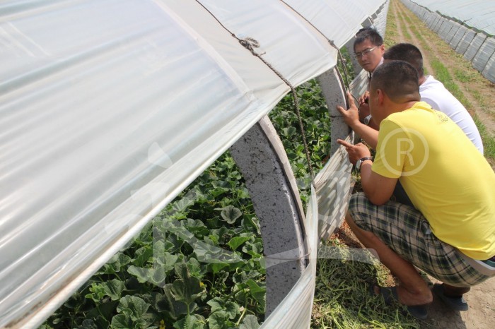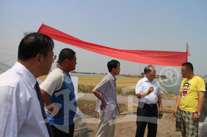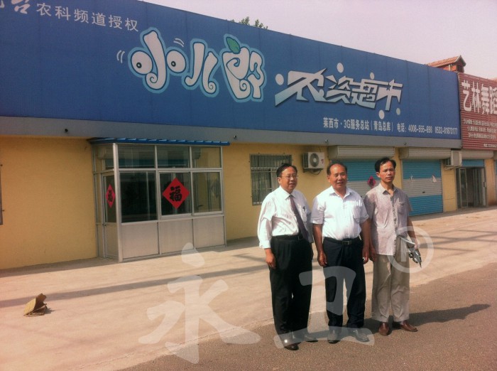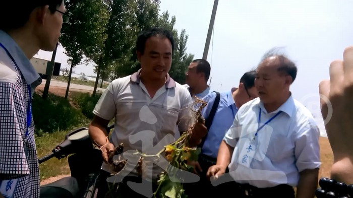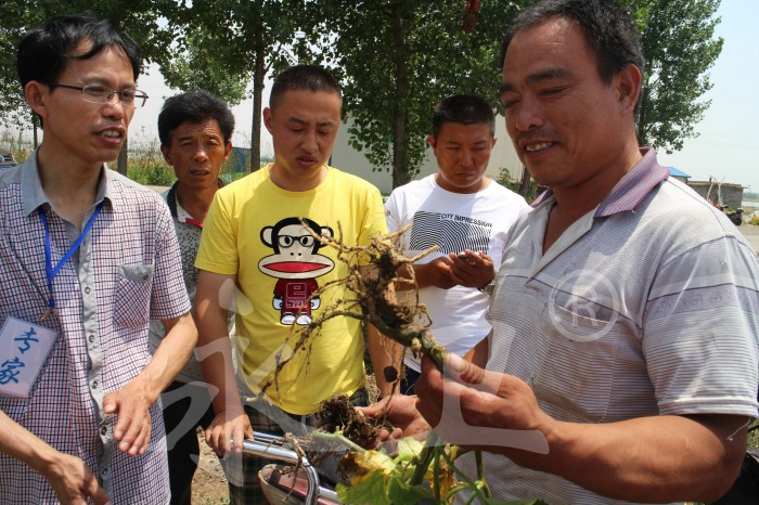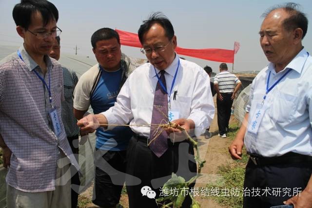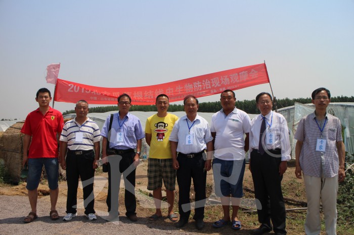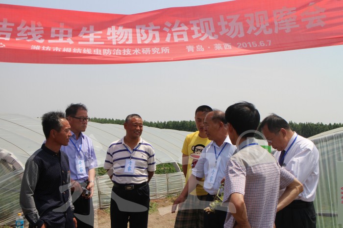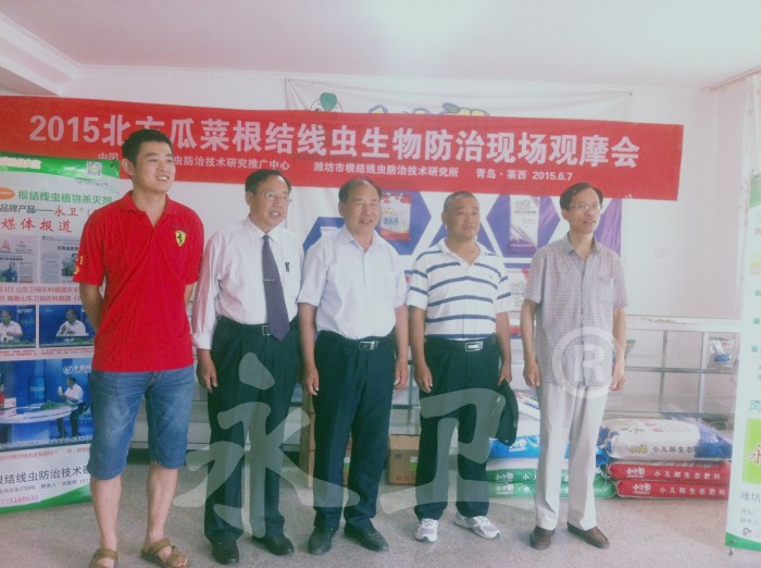 2015年6月7日,潍坊市根结线虫防治技术研究所所长毕乃亮(右一)会同山东卫视农科频道高级顾问张传义研究员(右二)、潍坊市农科院线虫专家王炳太(右三)前往青岛莱西举行了“2015北方瓜菜根结线虫生物防治现场观摩会”,并参观了山东卫视农科频道授权“小儿郎”农资服务站 。