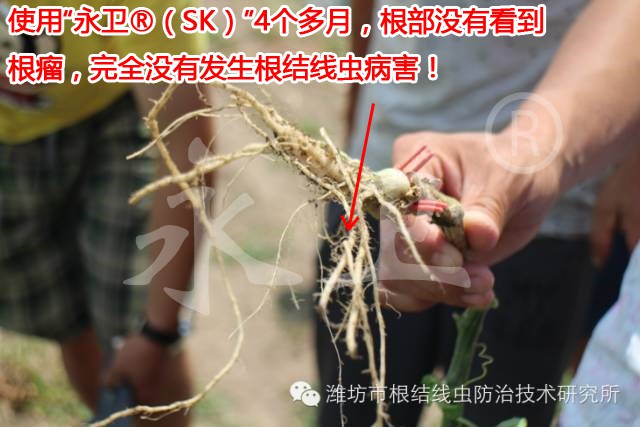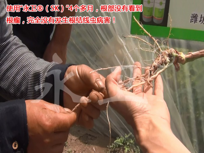 甜瓜大棚示范户孙华杰在甜瓜棚里拔根检查使用“永卫®(SK)”根部生长情况后,高兴地说:“使用‘永卫®(SK)’后完全没有长根瘤,一点问题都没有,根长的很粗壮!” 使用“永卫®(SK)”4个多月,根部没有看到根瘤,完全没有发生根结线虫病害!