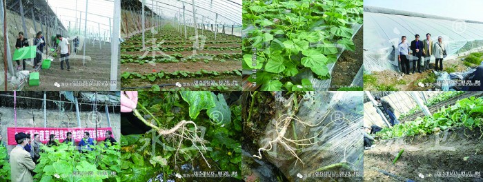 历时近6个月的黄瓜根结线虫防治示范结束简要总结如下:李新村黄瓜根结线虫生物防治示范棚,棚龄10年,面积1.5亩,瓜苗定植前未使用棉隆、威百亩等熏蒸剂处理土壤,完全按照潍坊市根结线虫研究所研发的“根结线虫生物防治技术规程”防治根结线虫。瓜苗定植使用15瓶,以后使用30瓶微喷灌根处理。共使用45瓶,每瓶按市场价60元计算,投入成本2700元(合亩成本1800元),黄瓜总共生长期近6个月,总收入5.2万元。示范户李新村非常满意!