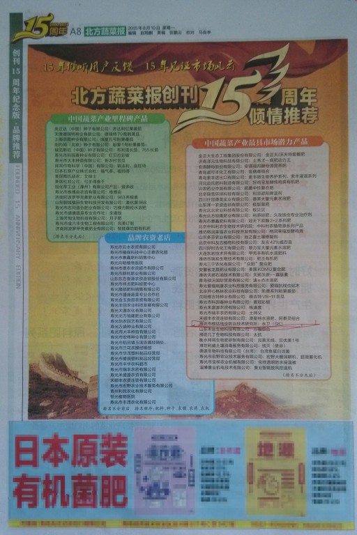 图三:2015年8月10日《北方蔬菜报》创刊15周年特刊D1版全面报道“永卫(SK)”