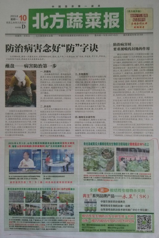 2015年8月10日《北方蔬菜报》创刊15周年之际,“永卫(SK)”入选“中国蔬菜产业最具市场潜力产品”,农药类排名第一位,“永卫(SK)”成为根结线虫生物防治首选药剂。
