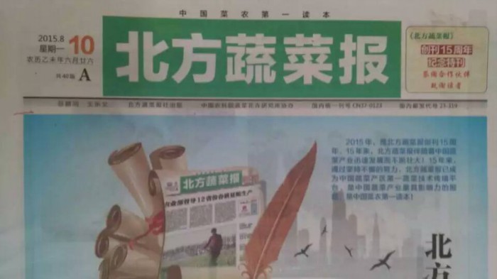 《北方蔬菜报》是国家特批的,中国惟一一份蔬菜类专业性报纸,根植中国蔬菜之乡——寿光。每周一期,24版,双色彩印。是一张真正面向全国、面向菜农和农资商的报纸。办报十多年来,长江以北所有蔬菜主产区有18万户农民订阅、受益,是全国涉农报刊中唯一一份直接送报到家的报纸,极大地提升了各地蔬菜发展水平,实实在在增加了菜农收入,被菜农亲切地称为“不说话的技术员”!