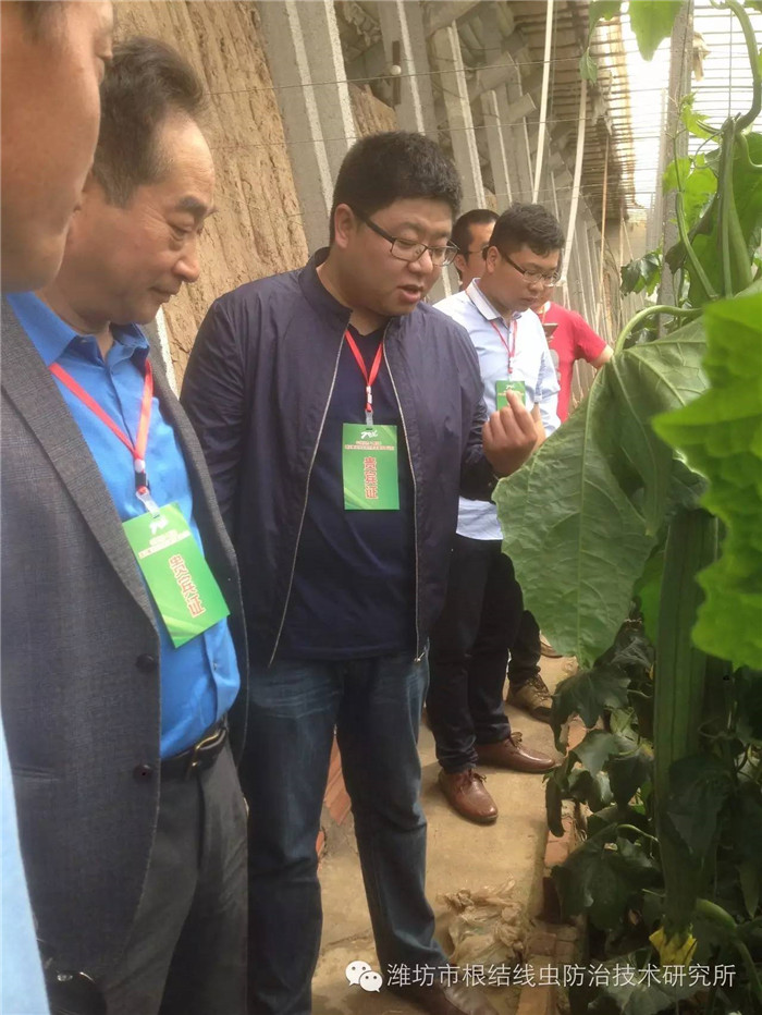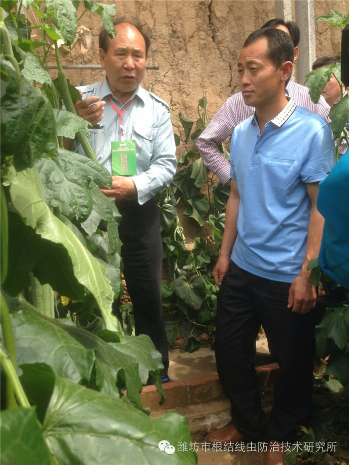 5月7号上午,专家一行来到寿光洛城潍坊市根结线虫研究所“根结线虫生物综合防控技术”示范户付金川的丝瓜大棚,付金川介绍:“永卫168”这种纯生物制剂效果非常好,去年8月24日定植,从定植后就开始使用,缓苗期就开始用药,一亩地冲两瓶一个月之后再冲一遍,轻的可以两个月冲一遍,使用已经两年了效果非好。