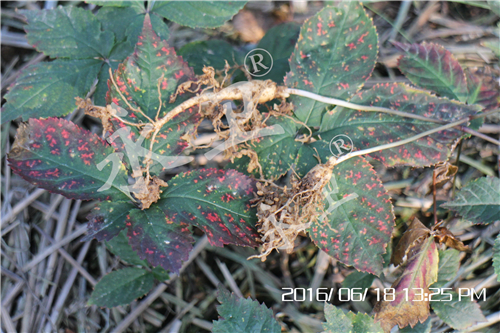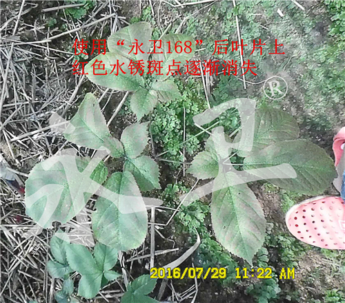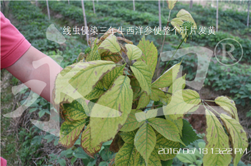 使用“永卫168”防治线虫35天后,二年生西洋参的红叶(水锈)现象得到改善,斑点变淡、消失,叶子上的水锈斑点越来越少。