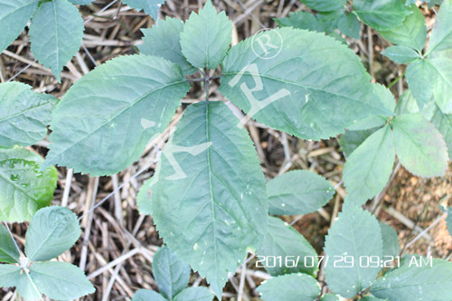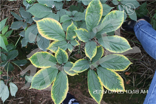 被线虫侵染导致叶片边缘焦枯的二年生西洋参,叶片上的主叶脉颜色浓绿,并且从主叶脉向外扩展,整个叶片呈现变绿的趋势。