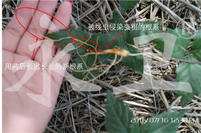 在现场我们看到,使用“永卫®168”灌根仅12天后,不同年限的西洋参叶片失绿发黄症状已全部消失,叶片沿叶脉恢复绿色,地上部正常生长,地下部开始长出新的大量毛细根并且没有根结,苗龄小的参苗使用后效果更加明显。这些现象说明,使用“永卫®168”1000倍药液能够有效地控制西洋参线虫的为害,促进参苗生出新的根系,防止线虫的侵染。