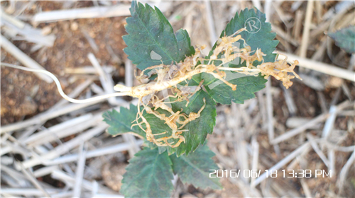 拔出使用“永卫®168”后的一年生西洋参后发现,之前被线虫侵染后变粗的根系上继续长出了新根。
