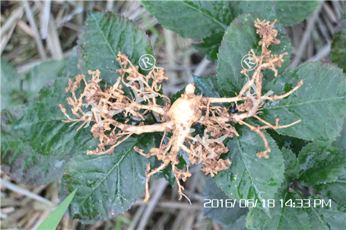 西洋参种植大户王总的西洋参基地面积300多亩,基地内有1年生、2年生的西洋参参苗以及3年生西洋参植株,栽培密度约80000株/亩。2015年下半年开始发现植株出现叶片失绿变黄、叶缘焦枯等症状,拔根后发现根部带有颗粒状的根瘤,且根毛非常少,初步诊断为线虫病,用过多种药剂以及对线虫有抑制作用的菌肥后并没有控制住线虫病的发展。