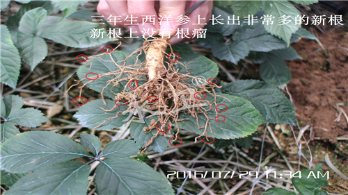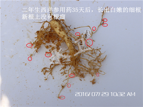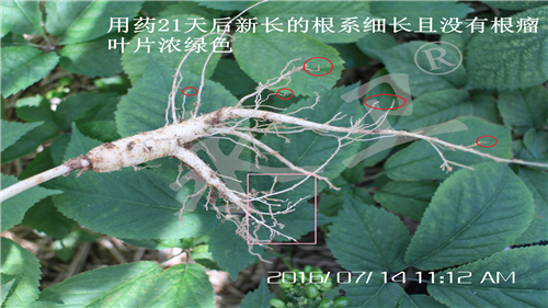 三年生西洋参使用“永卫®168”灌根21天后,叶片恢复绿色,长出新根,新根上没有根瘤。