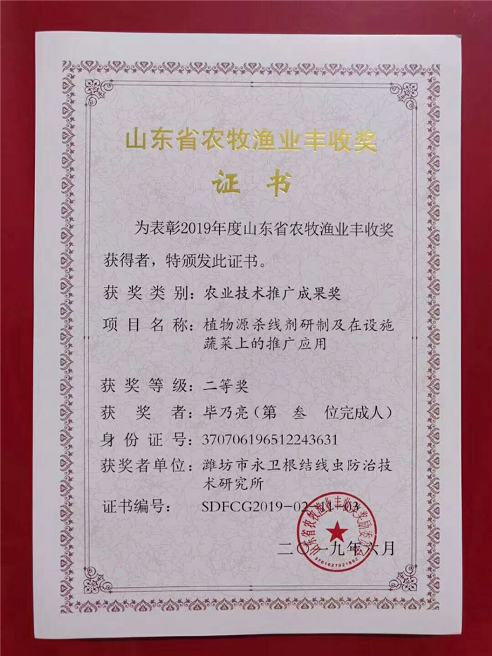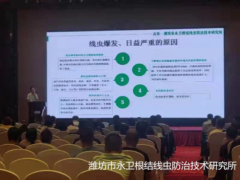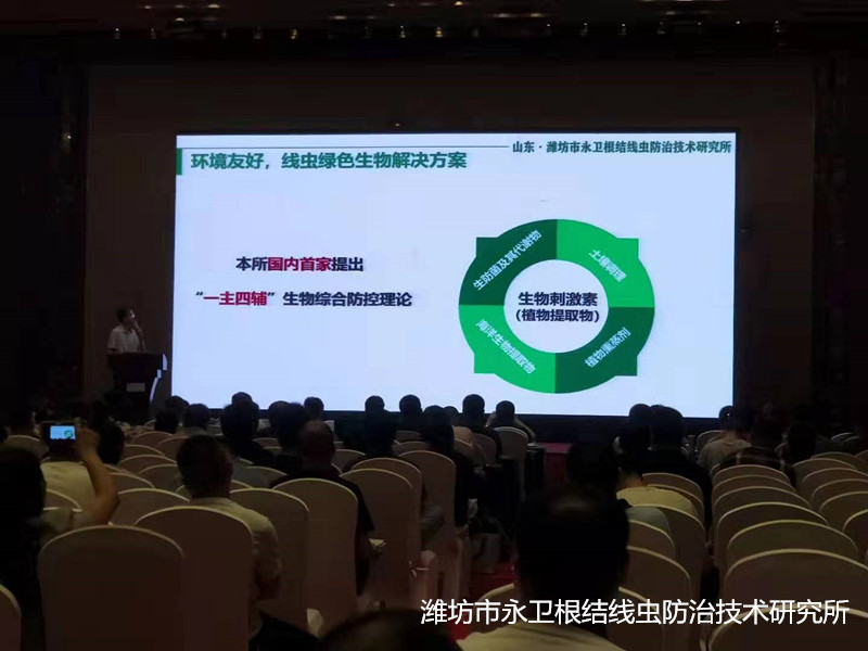 潍坊市永卫根结线虫防治技术研究所(2009年12月潍坊市科技局批准成立潍坊市根结线虫防治技术研究所,2019年1月更现名),依托山东省线虫防治技术研究推广中心及中国芦笋研究中心、中国科学院上海生命科学研究院、中国农业大学、西北农林科技大学、华中农业大学、山东农业大学、青岛农业大学、山东省农业科学院、山东省林业科学院、潍坊市农业科学院农业生物技术研究中心及多位国内外著名线虫研究专家教授成立,是全国唯一一家“根结线虫生物综合防控专业研发推广机构”,线虫生物综合防控技术国内领先,品牌定位“中国生物技术价值典范、线虫综合防控高端品牌”,产品入选“中国蔬菜产业最具市场潜力产品”,纯天然、无残留、安全环保;防效突出、防控时间长,能替代并超越现有常用化学农药;不伤根、不伤苗,极难产生抗性;能替代熏蒸,能防、能治,安全高效。适合于各种作物及绿色生态有机出口基地、保护地栽培等大面积推广使用,完全符合绿色生态、安全放心农产品生产的要求。